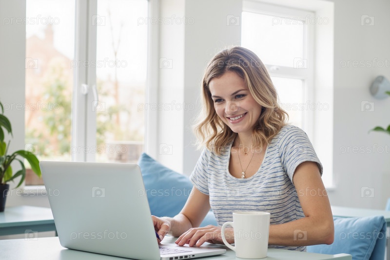 Молодая взрослая женщина улыбается, работая на ноутбуке дома