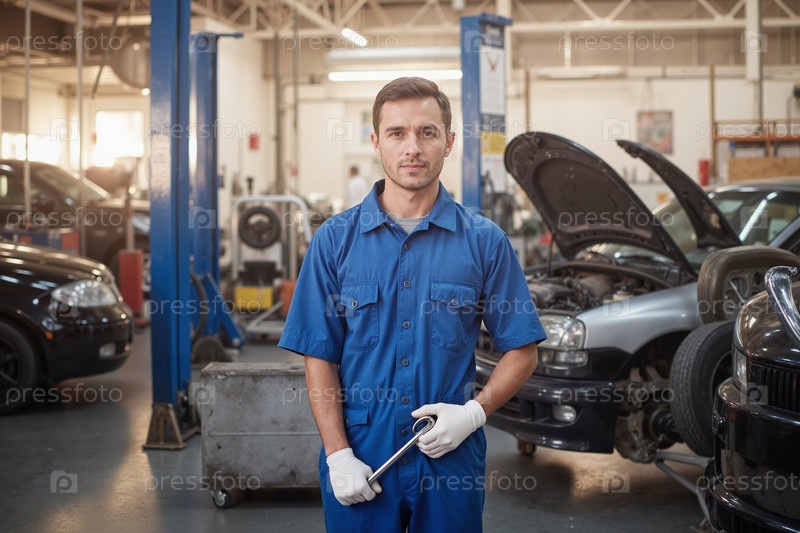 Портрет молодого взрослого мужчины, стоящего в автосервисе и работающего