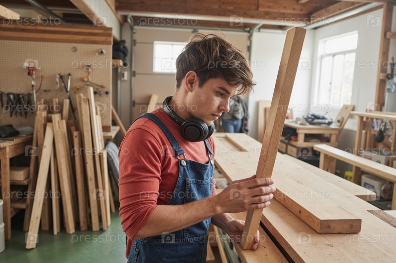 Молодой человек осматривает деревянную доску во время работы в столярной мастерской