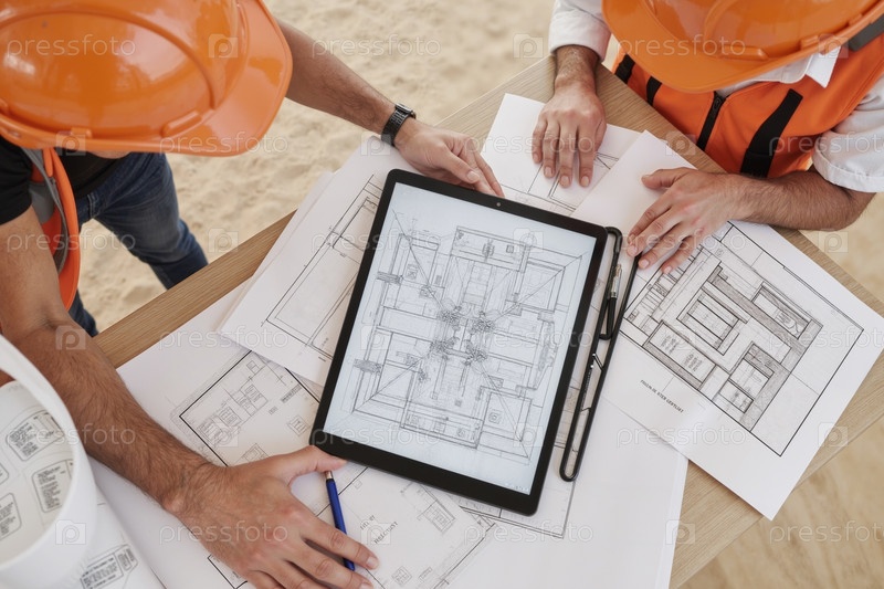 Мужчины, сотрудничающие над архитектурным планом с помощью планшета