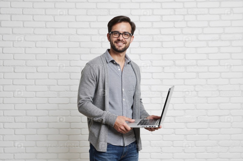 Портрет молодого взрослого мужчины, улыбающегося при использовании ноутбука