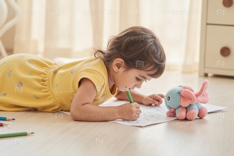 Девочка рисует на полу, играя с детской игрушкой плюшевого слона