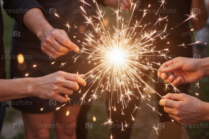 Руки людей, держащих в руках искры и празднующих вместе на свежем воздухе
