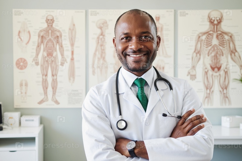 Портрет чернокожего мужчины, улыбающегося уверенно в медицинском кабинете