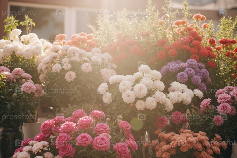 Цветущие хризантемы и розы создают яркий открытый садовый дисплей