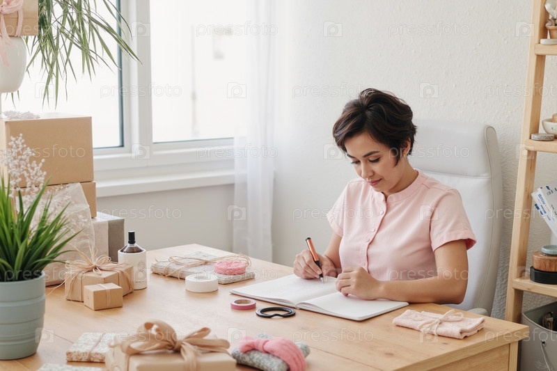 Женщина, пишущая заметки во время работы в домашнем офисе