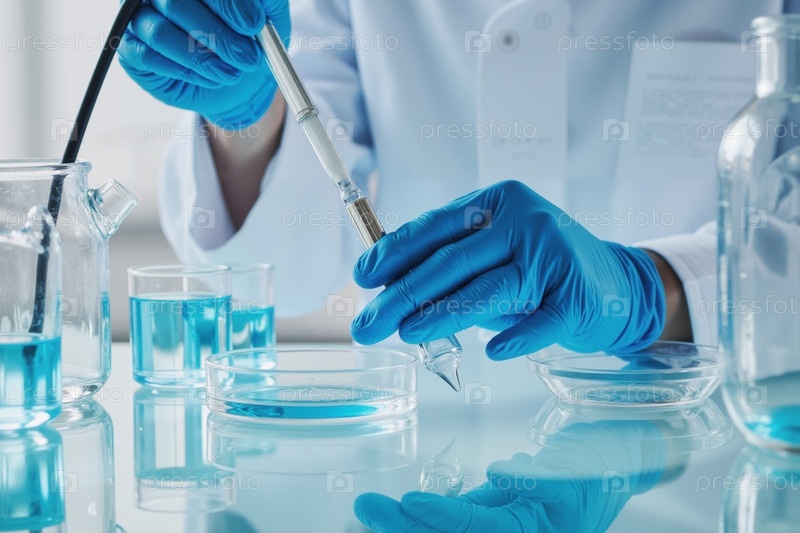 Молодой ученый-взрослый проводит лабораторный эксперимент со стеклянными изделиями
