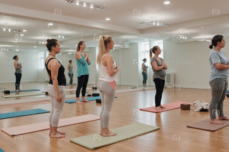 Группа молодых взрослых женщин, практикующих йогу в фитнес-студии