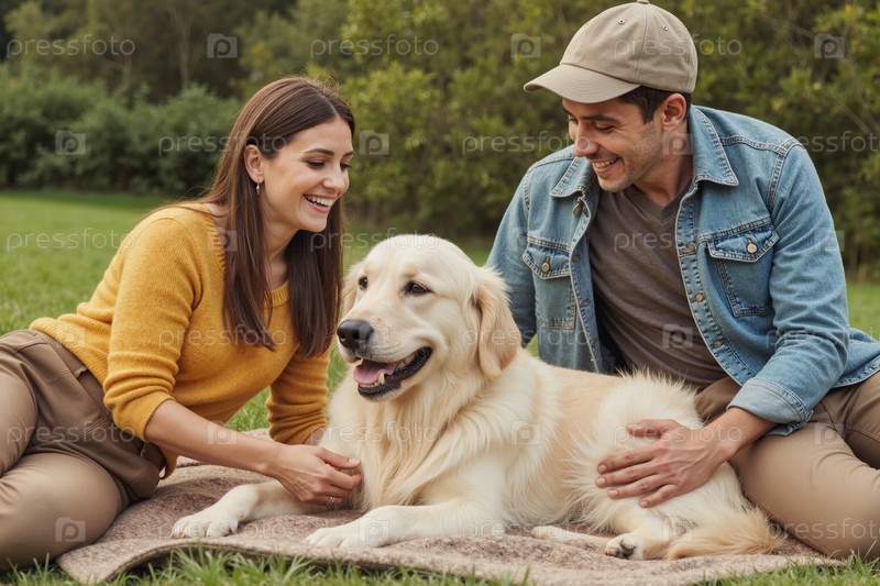Молодая женщина и мужчина отдыхают на свежем воздухе с собакой золотого ретривера