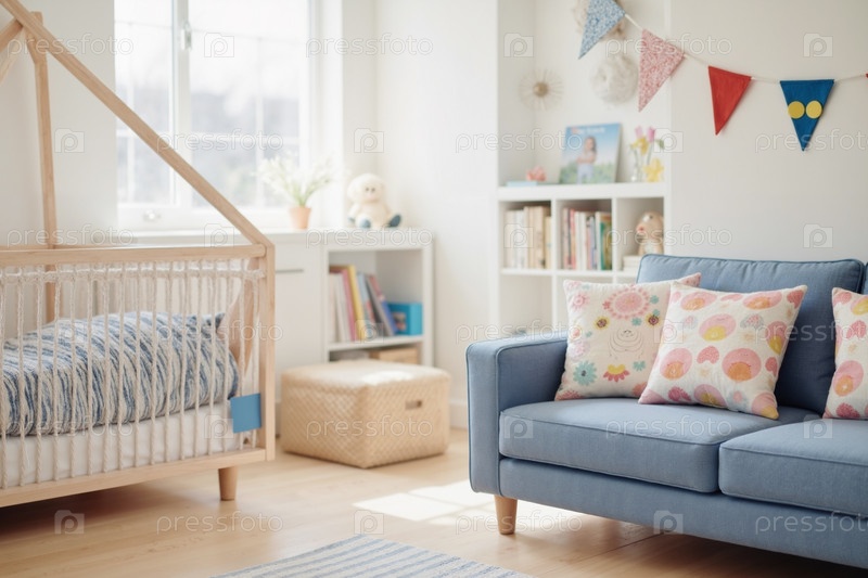 Пустая детская комната с колыбелью и диваном в ярком солнечном интерьере