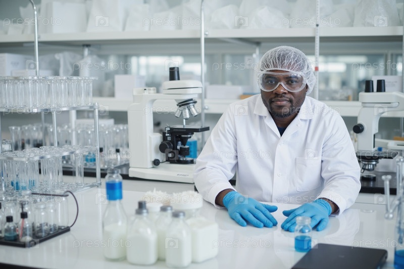Черный мужчина среднего возраста, работающий в лаборатории и проводящий научные исследования