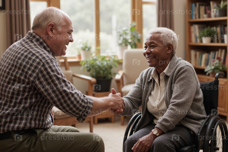 Старший мужчина приветствует старшую чернокожую женщину с инвалидностью в помещении