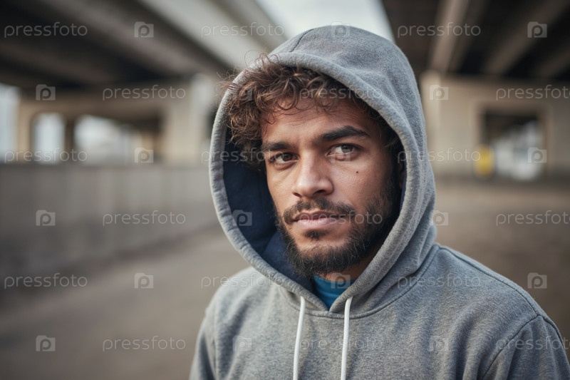 Портрет молодого взрослого испаноязычного мужчины, носящего толстовку с капюшоном и стоящего на улице