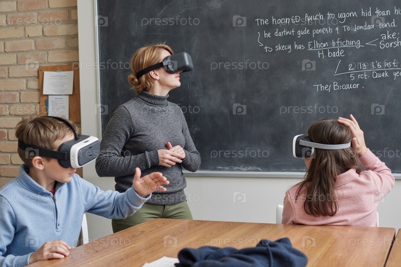 Учительница направляет школьников с помощью гарнитур виртуальной реальности
