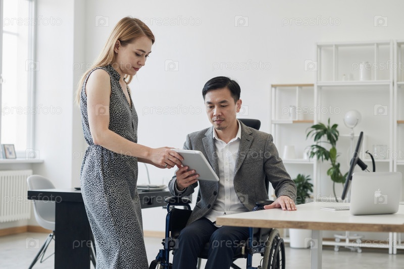 Молодая взрослая женщина показывает цифровой планшет азиатскому мужчине с инвалидностью