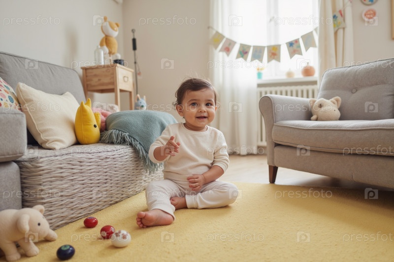 Портрет ребенка, сидящего на полу, улыбающегося и жестов в гостиной