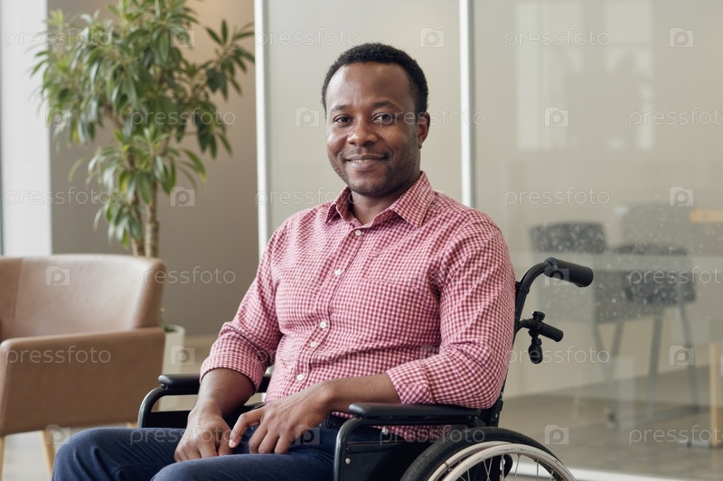 Портрет молодого взрослого чёрного мужчины с инвалидностью, улыбающегося в офисной обстановке