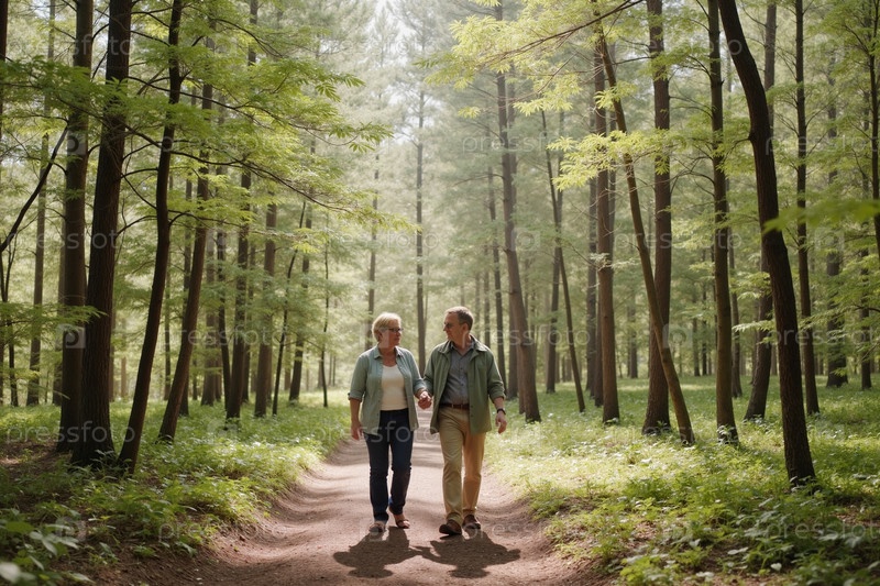 Старшая пара, идущая вместе по лесной тропе, держась за руки