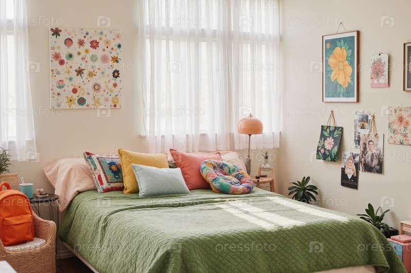 Уютный интерьер спальни с разноцветными подушками и солнечными элементами декора