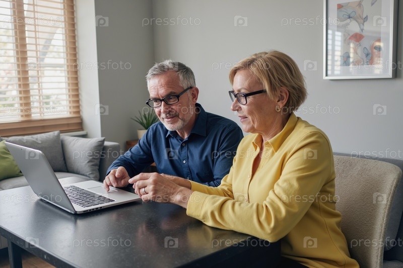 Пара средних лет, использующая вместе ноутбук в современной гостиной