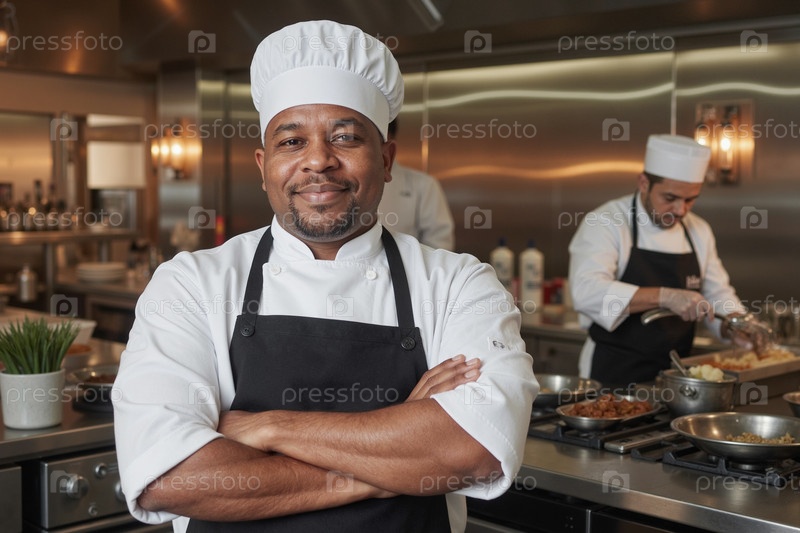 Портрет чернокожего повара средних лет, уверенно стоящего на кухне ресторана