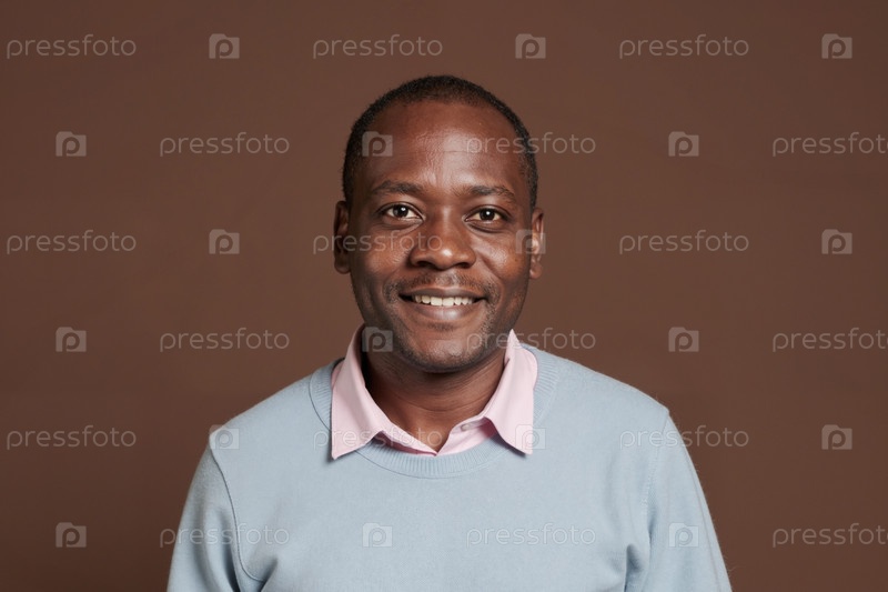 Портрет чернокожего человека среднего возраста, улыбающегося на фоне коричневой студии