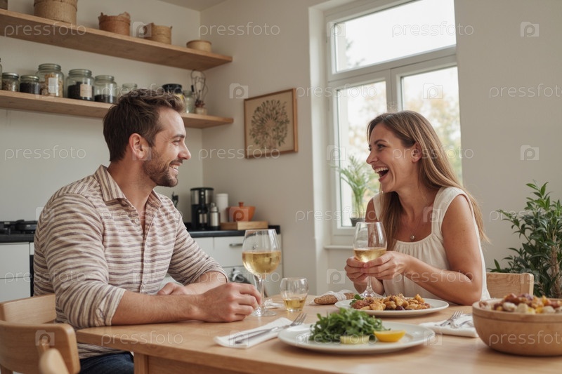Молодая взрослая пара наслаждается обедом и смеётся вместе в помещении