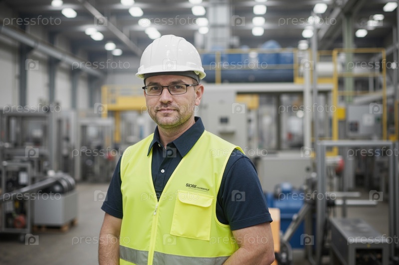 Портрет мужчины среднего возраста, одетого в жесткую шляпу и стоящего на фабрике