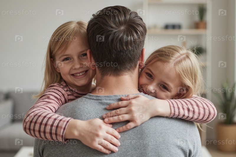 Две девушки обнимают взрослого мужчину и улыбаются дома