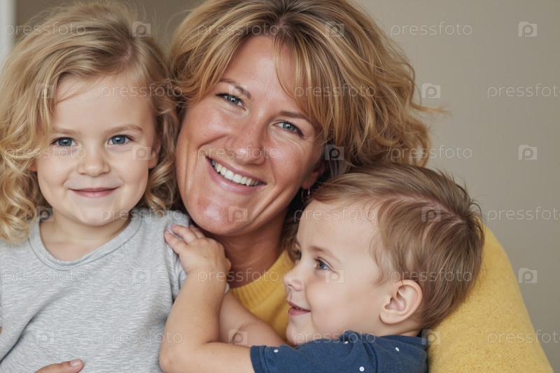 Портрет женщины среднего возраста, обнимающей двух маленьких детей с улыбкой