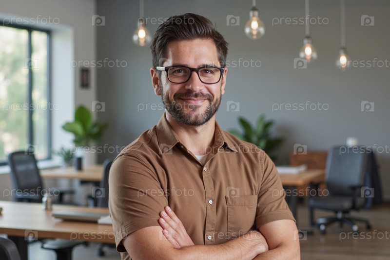 Портрет молодого взрослого мужчины, уверенно улыбающегося в современном офисе