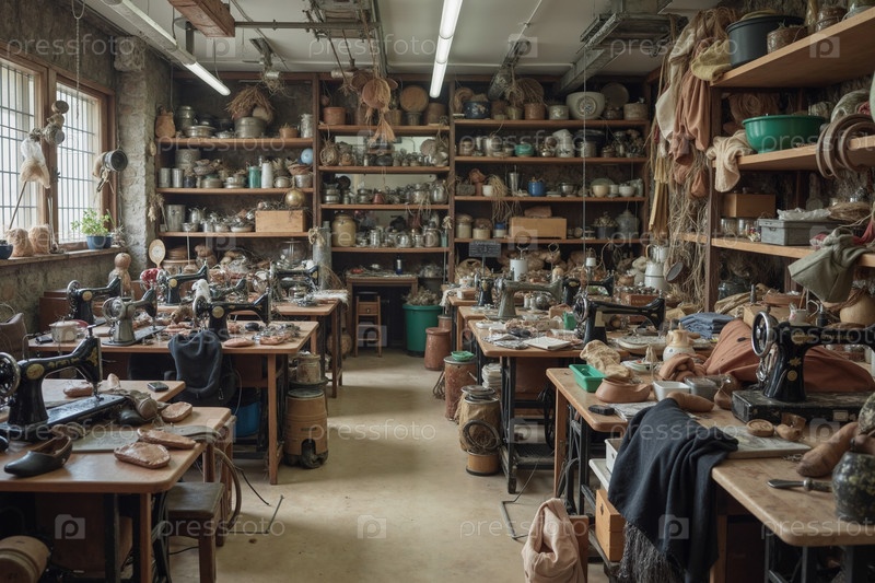 Пустая мастерская ремесленников с швейными машинами и выставкой ручной керамики