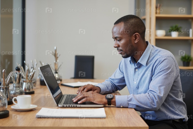 Молодой взрослый чернокожий мужчина работает на ноутбуке в современной офисной среде
