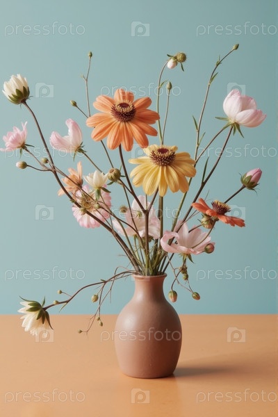 Букет свежих диких цветов, расположенных в керамической вазе на пастельной поверхности