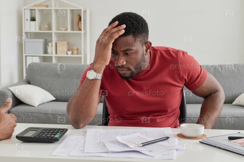 Молодой взрослый чернокожий мужчина просматривает финансовые документы и чувствует себя напряженным