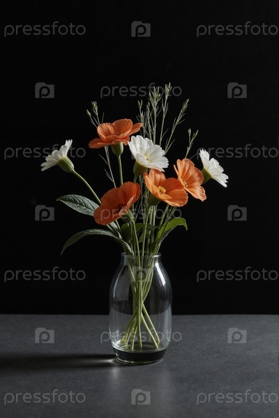 Букет апельсинов и цветов, расположенных в стеклянной вазе на темной поверхности