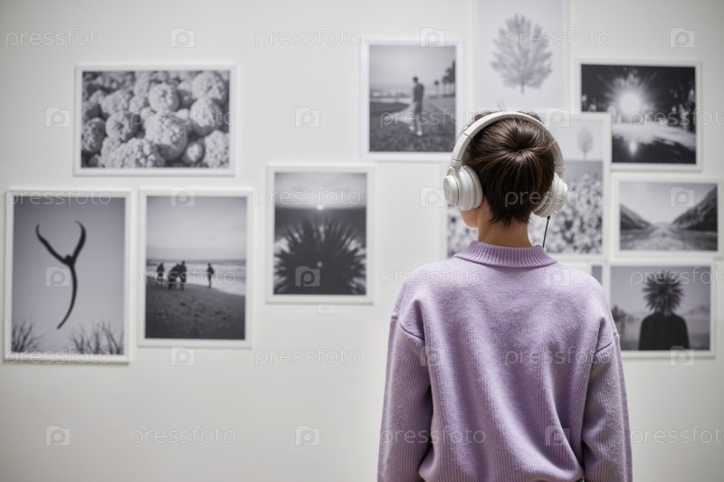 Девушка-подросток, которая носит наушники, наблюдает за черным и фотографирует