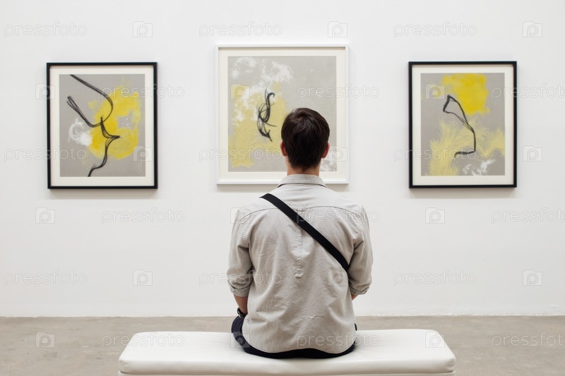 Молодой человек наблюдает абстрактные картины в галерее современного искусства