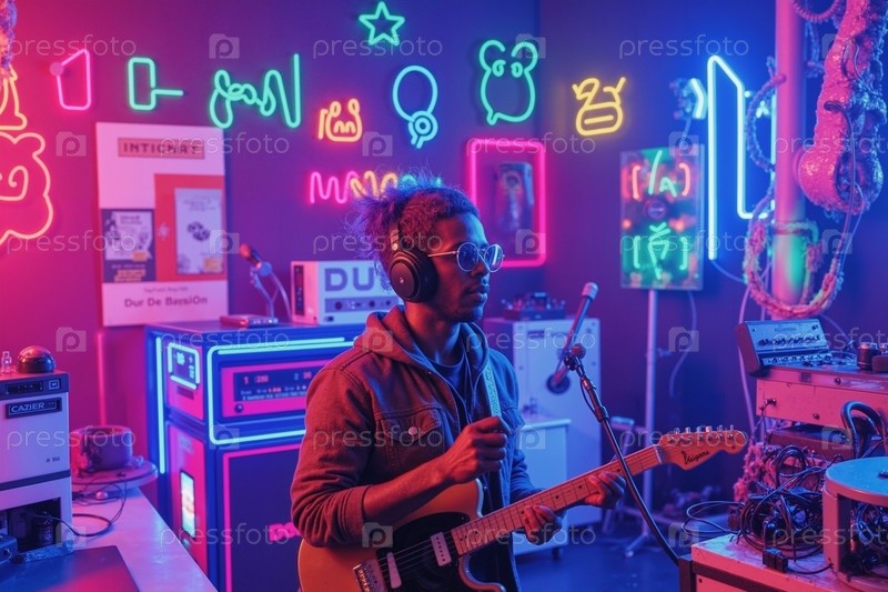 Молодой взрослый чернокожий мужчина играет на электрической гитаре в музыкальной студии Neon Lit