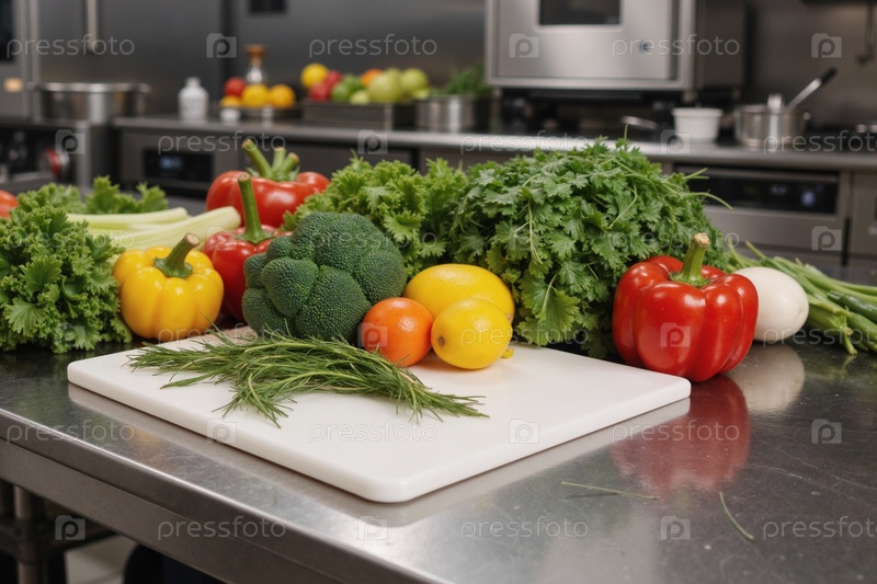 Свежие овощи и травы расположены на кухонном столе для приготовления пищи
