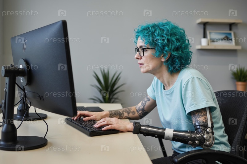 Молодая взрослая женщина с протезированной рукой работает на компьютерном столе