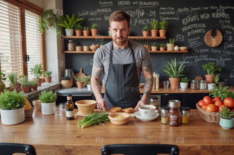 Портрет молодого взрослого мужчины, готовящего ингредиенты на современной кухне