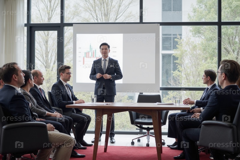 Среднего возраста азиатский мужчина, представляющий бизнес-отчет различным коллегам