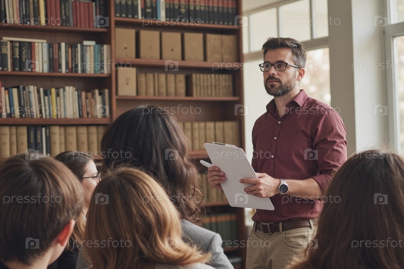 Молодой взрослый человек преподает разной группе студентов в библиотеке