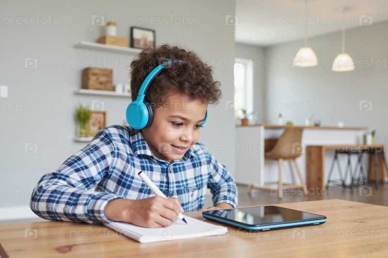 Улыбающийся молодой чернокожий мальчик в наушниках учится с планшетом дома