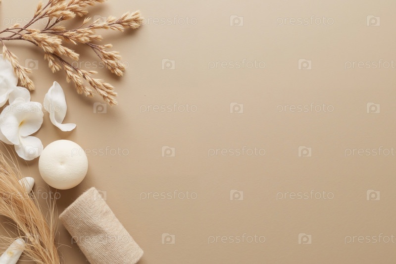 Аксессуары Spa расположены на бежевой поверхности, создавая расслабляющую оздоровительную атмосферу