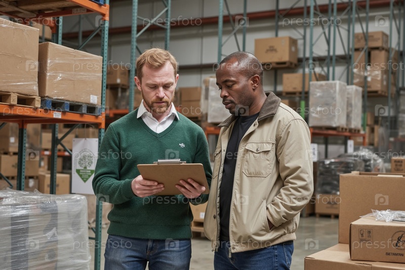 Молодой взрослый мужчина показывает блокнот черному молодому взрослому человеку в хранилище
