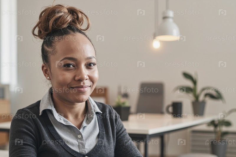 Портрет молодой взрослой чернокожей женщины, улыбающейся уверенно в современном офисе