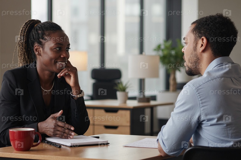 Молодая взрослая чернокожая женщина проводит интервью с молодым мужчиной в офисе