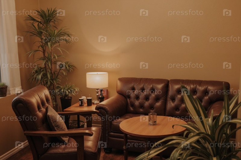 Пустая гостиная с кожаным диваном и креслом в уютной обстановке